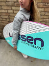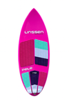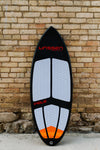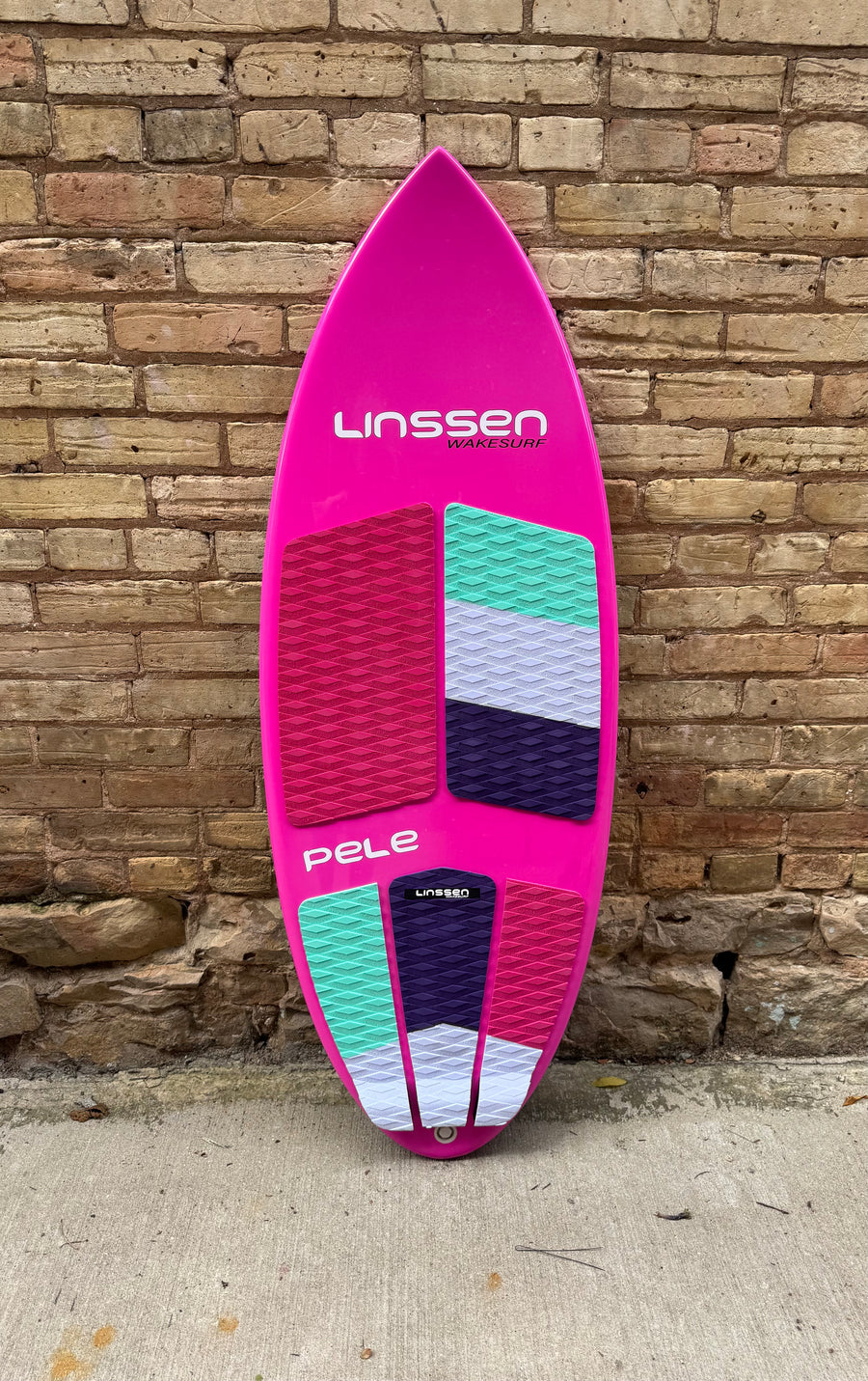 Can't decide between surf or skim? Experience unparalleled performance and durability on the water with Pele, the premier surf/skim board for all skill levels. Inspired by the Hawaiian goddess of volcanoes and the birthplace of the islands, Pele boasts vibrant colors and top-quality materials. This hybrid board combines versatility and performance for an exceptional wave-riding experience. Featuring a customizable 3-fin setup and a flat, smooth bottom, it offers speed and efficient planing thanks to its minimal rocker. The rounded tail enhances maneuverability, enabling sharper turns and improved control. Softer rails provide increased grip on the wave, facilitating a smooth transition to skim-style riding without the commitment of a full skim board. Ideal for riders seeking a forgiving, yet responsive, board that supports progression. Available in two color options to match your style. Traction pads come pre-applied. The 4' 10" black Pele comes with 3 surf and 3 skim fins, providing extensive customization possibilities. All other black Pele models and every size of the pink Pele are equipped with 3 surf fins and 1 skim fin.