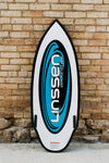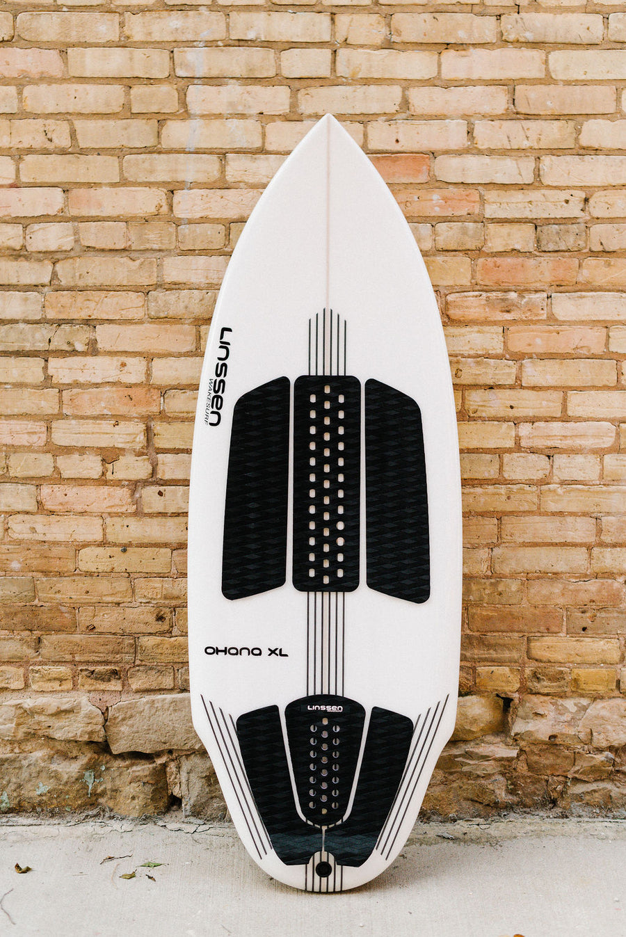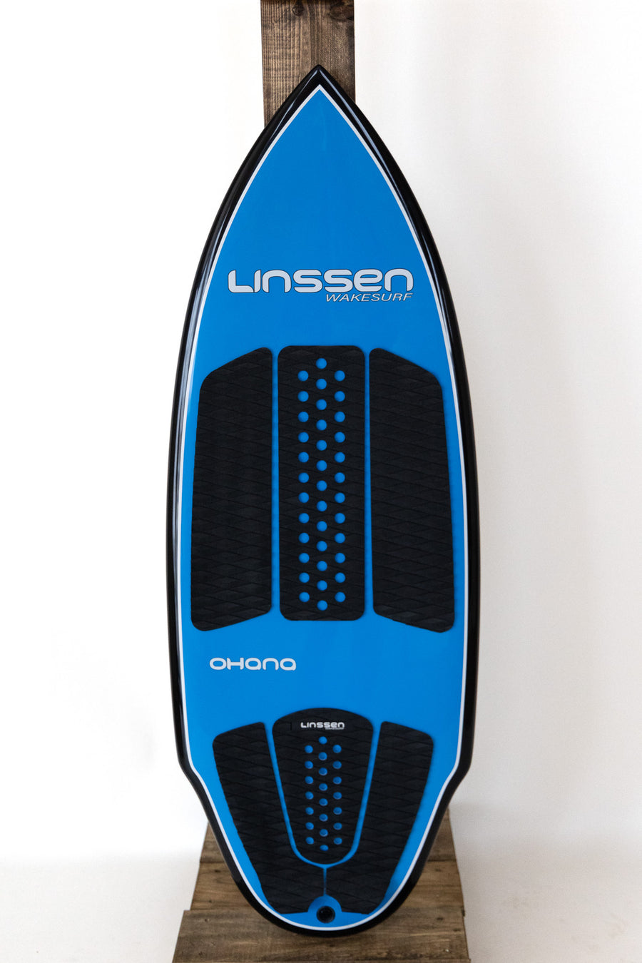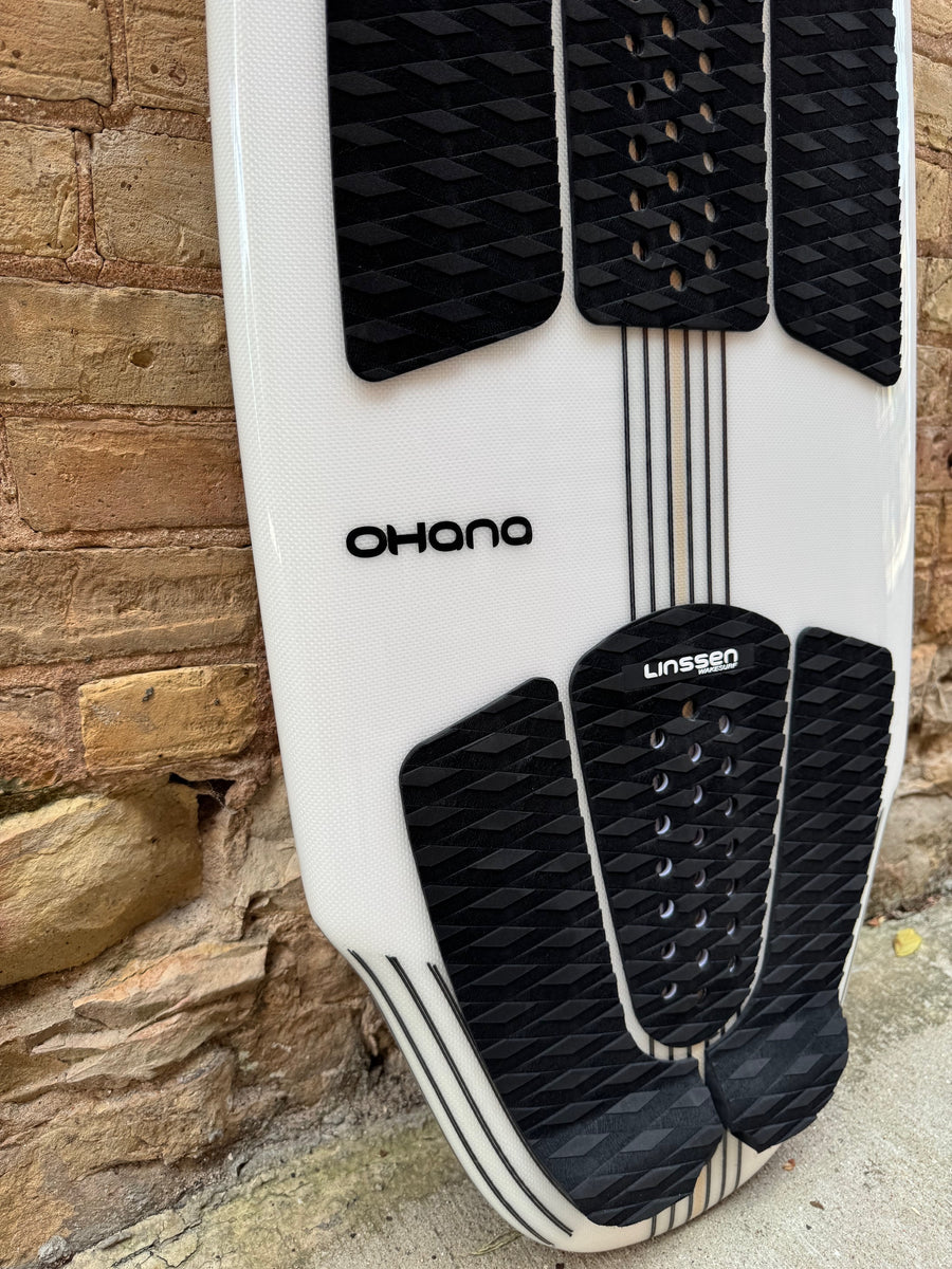 The Ohana wakesurf board, derived from its Hawaiian name meaning "family", boasts striking blue and crisp white colors in two impressive designs, and is ideal for those with an intermediate to advanced skill level. The thoughtfully designed concave contour, progressive rails, and moderate rocker result in improved velocity and maneuverability. These features also allow for tighter turns and effortless transitions on the wave. Additionally, the concave contour helps generate lift, maintaining the board on the surface, and enhances its speed and responsiveness. Traction pads and 2 surf fins are included with the Ohana.