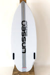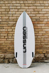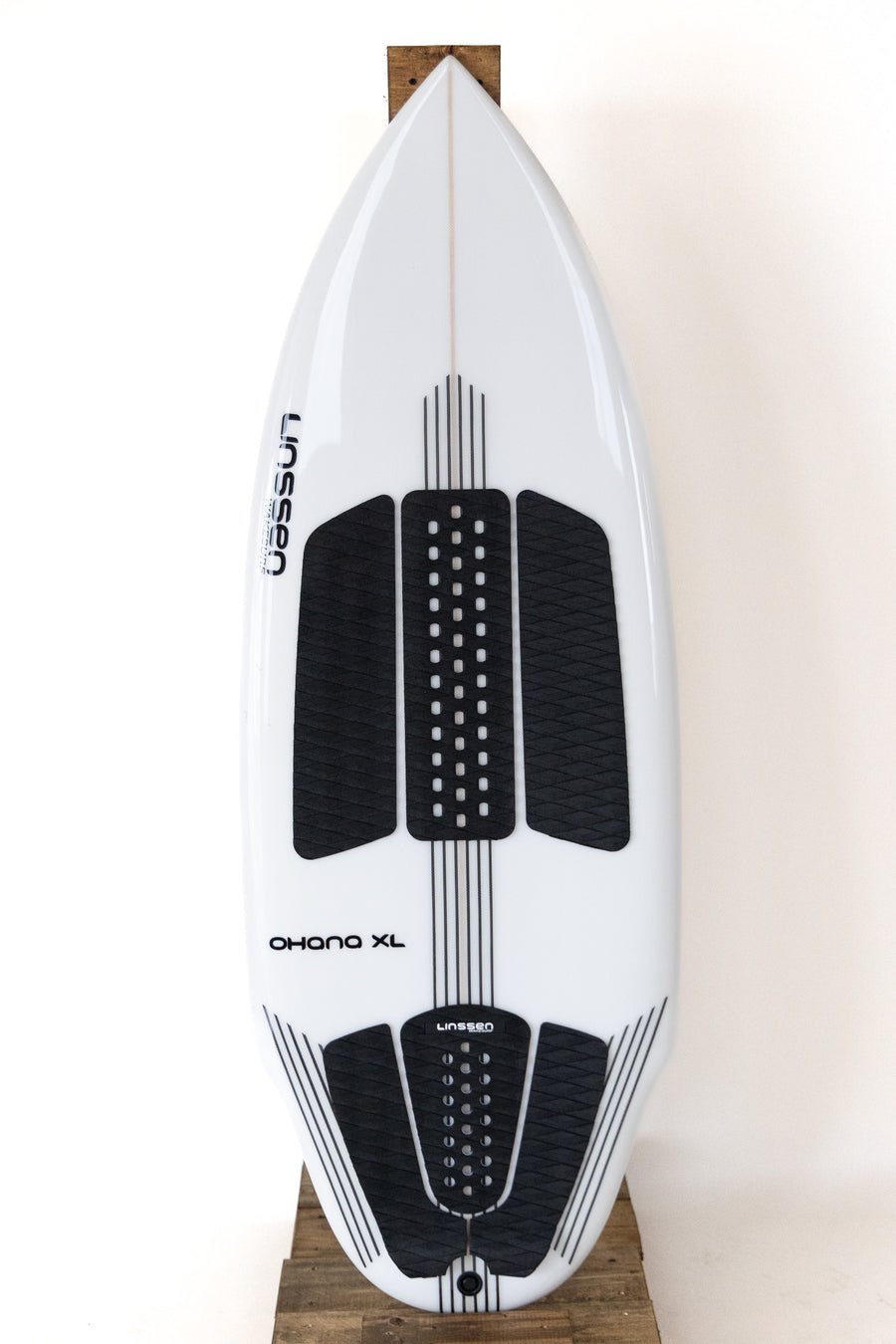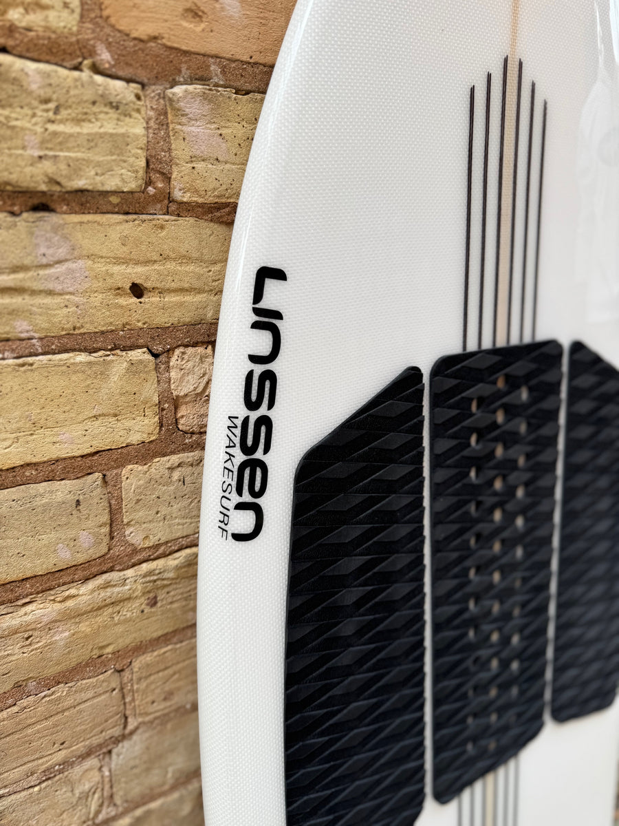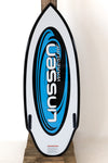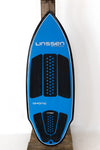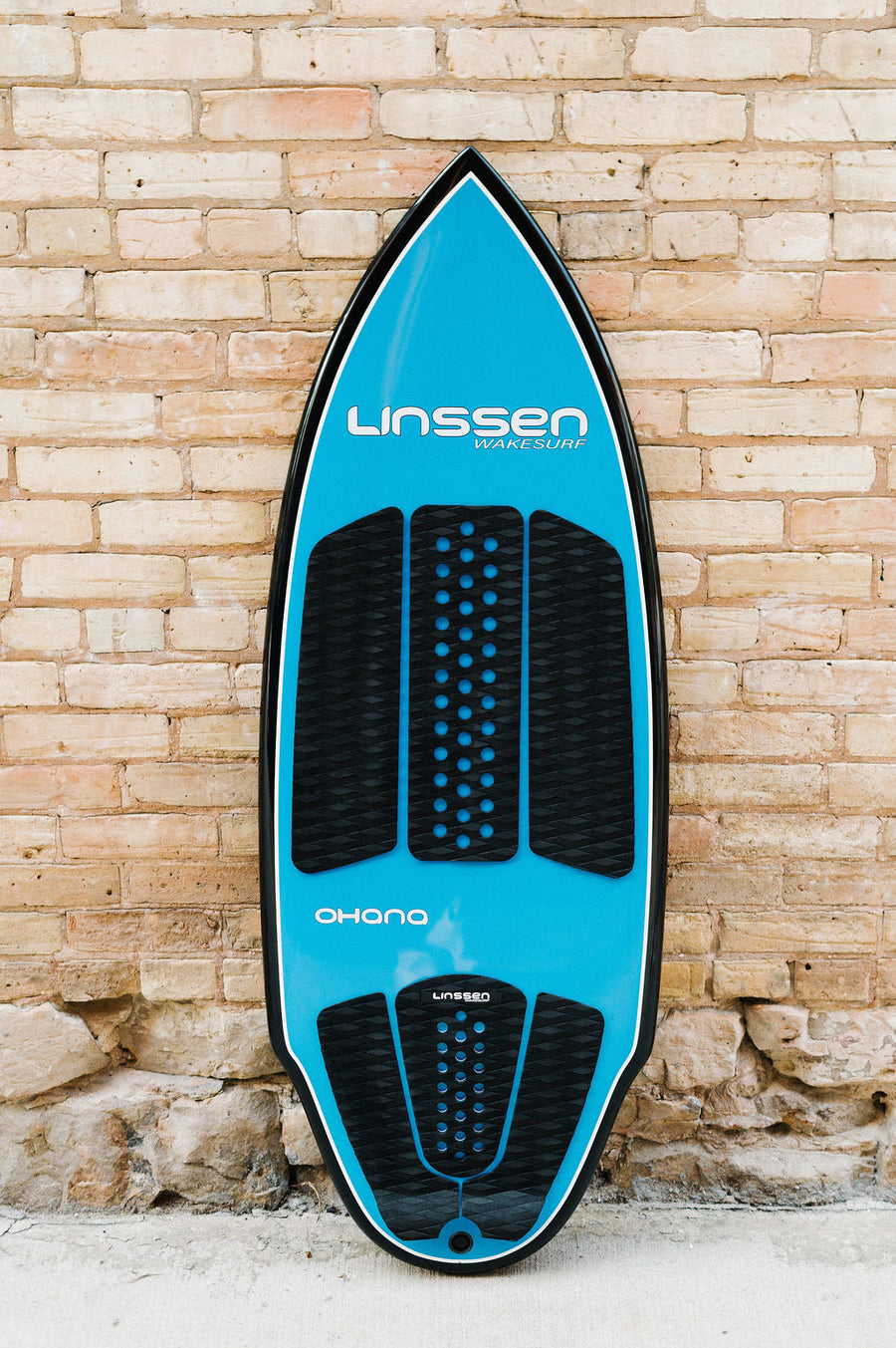 The Ohana wakesurf board, derived from its Hawaiian name meaning "family", boasts striking blue and crisp white colors in two impressive designs, and is ideal for those with an intermediate to advanced skill level. The thoughtfully designed concave contour, progressive rails, and moderate rocker result in improved velocity and maneuverability. These features also allow for tighter turns and effortless transitions on the wave. Additionally, the concave contour helps generate lift, maintaining the board on the surface, and enhances its speed and responsiveness. Traction pads and 2 surf fins are included with the Ohana.